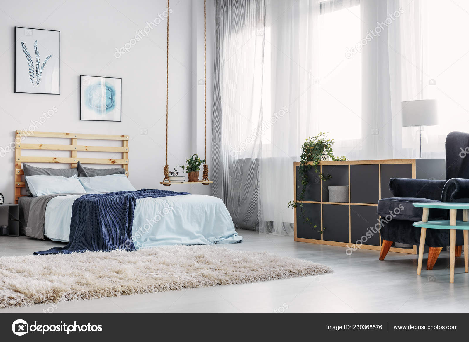 Corner White Wall Minimalistic Bedroom Wooden Floor Grey Carpet