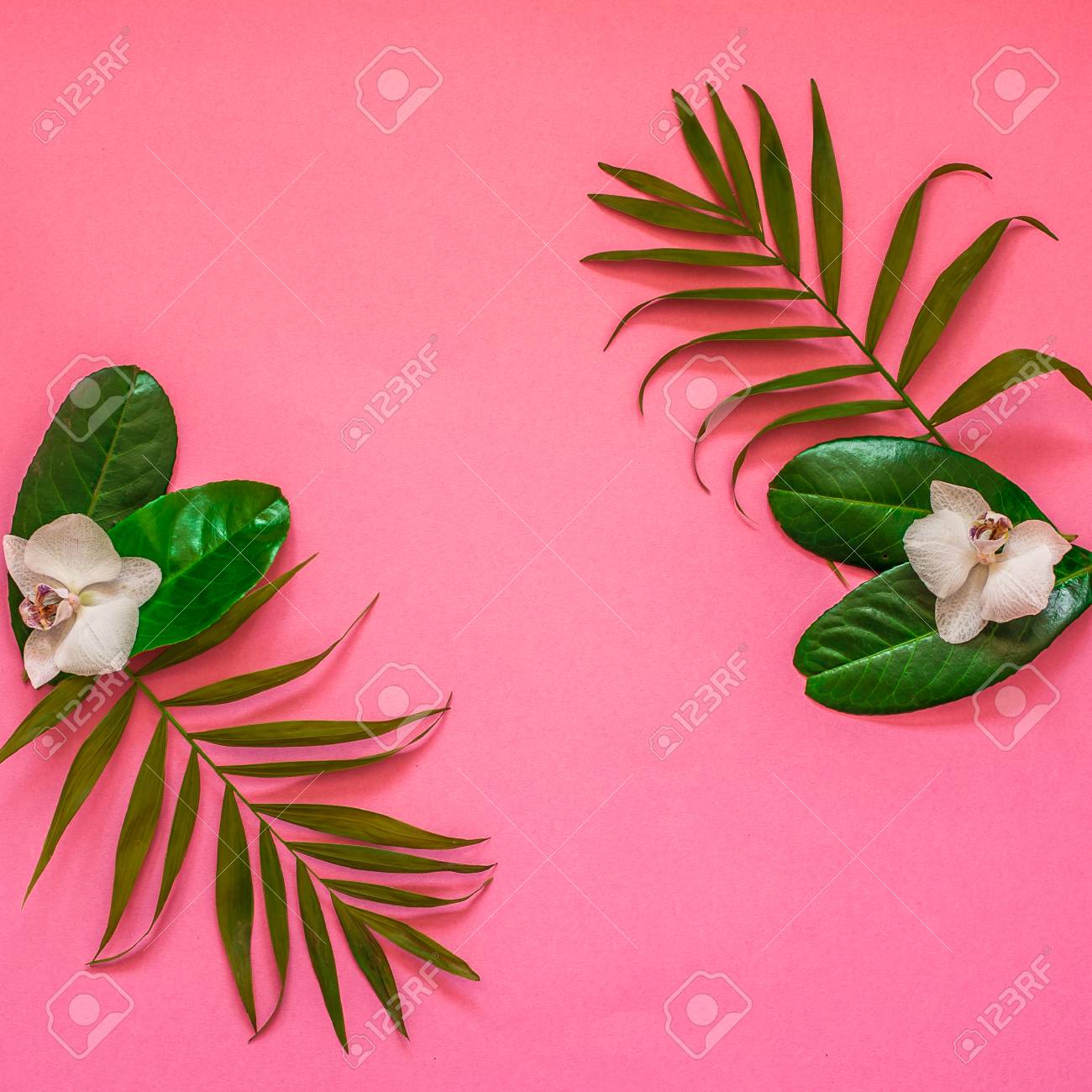 Flatlay With Tropical Plants And Flowers On Pink Background With
