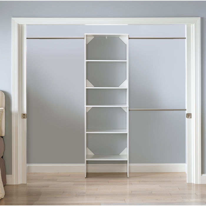 Can fit a reach in closet up to 10 wide and be mounted on a wall or set on the floor. White closet organizer includes tower and 3 expandable hang rods. 4 to 6 poles units available.
