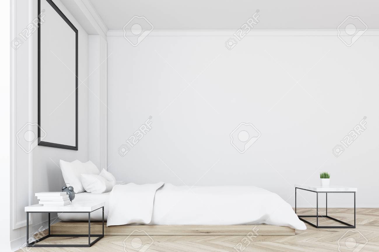 Side View Of A White Bedroom Interior With A Double Bed A Coffee