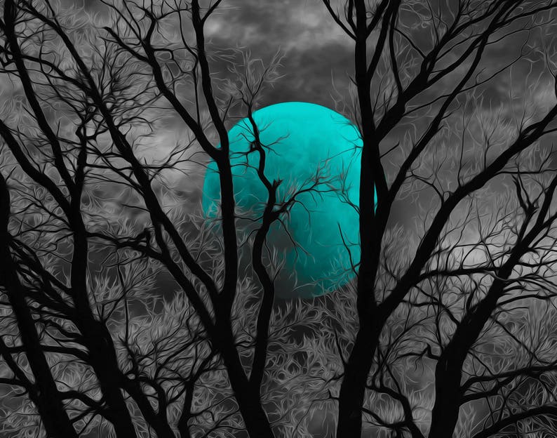 Black White Turquoise Wall Art Tree Moon Turquoise Bedroom Etsy
